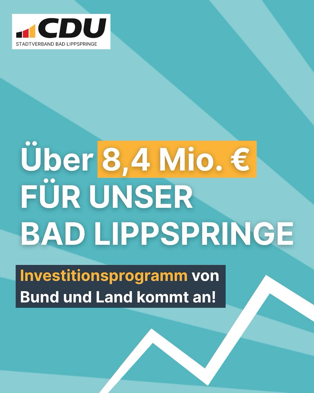 💪 Über 8,4 Millionen Euro für Bad Lippspringe! Mit dem Nordrhein-Westfalen-Plan für gute Infrastruktur startet die Landesregierung das größte Investitionsprogramm der Landesgeschichte. 👉 Insgesamt über 30 Milliarden Euro fließen landesweit in Kitas, Schulen, Straßen, Brücken, Krankenhäuser und Sportanlagen. Auch Bad Lippspringe profitiert ? mit rund 8.480.462,53 ? für die kommenden Jahre! 💶 Diese Mittel schaffen Planungssicherheit, entlasten unsere Stadt und ermöglichen dringend notwendige Investitionen vor Ort. Ob Bildung, Verkehr oder Freizeit: Diese Investitionen stärken unsere Heimat nachhaltig und machen Bad Lippspringe fit für die Zukunft. ➡️ Wir als CDU setzen uns dafür ein, dass das Geld dort ankommt, wo es gebraucht wird ? bei den Menschen in unserer Stadt. #CDU #BadLippspringe #NRWPlan #ZukunftGestalten #CDUwirkt #Infrastruktur #GemeinsamStark #HeimatGestalten #CDUNRW
