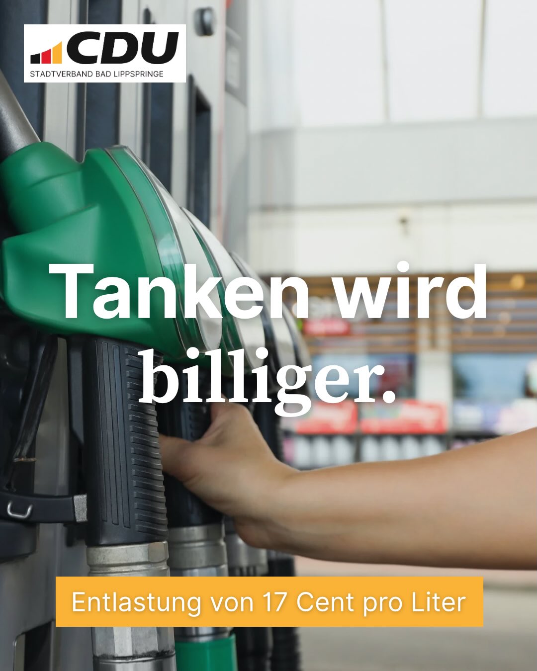 Die CDU geführte Bundesregierung wird ein Energiesofortprogramm umsetzen: Dabei sollen Verbraucher und Wirtschaft bei den Preisen für Kraftstoffe um rund 1,6 Milliarden Euro entlasten werden. Dafür werden die Energiesteuern bei Diesel und Benzin um jeweils ca. 17 Cent brutto pro Liter begrenzt auf zwei Monate senken. #tanken #spritpreise #badlippspringe #cdu #tankstelle